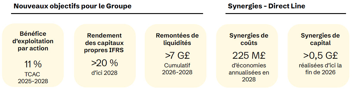 - Nous prévoyons d’atteindre les objectifs de 2 G£ de bénéfice d’exploitation et de 1,8 G£ de production de fonds propres opérationnels selon Solvabilité II un an plus tôt que prévu, grâce à des performances exceptionnelles dans l’ensemble du Groupe et sans tenir compte des contributions de Direct Line. Nous prévoyons un bénéfice d’exploitation du Groupe pour l’ensemble de l’année 2025 d’environ 2,2 G£, dont 0,15 G£ pour Direct Line.
